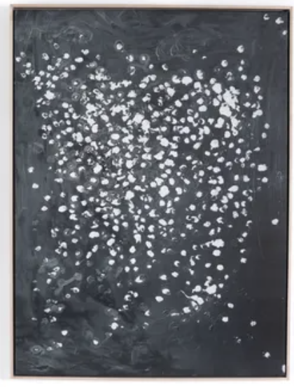 To furnish the bedroom, we opted for a light grey upholstered bed and paired it with some wood-cubed nightstands. Above those nightstands, we sourced these charming sconces boasting curved lines that gave off an air of youthfulness while still maintaining their stylishness. Above the bed, a modern piece of art resembling a starry sky was chosen. We opted for a timeless black dresser, accompanied by a classic round mirror hung above it.